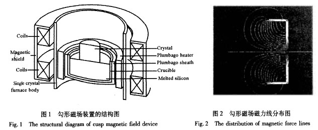 勾形磁場是(shì)由空心方銅(tóng)管密繞而成(chéng)的兩個完全(quan)相同的獨立(li)圓形直流線(xian)圈和外磁屏(píng)蔽體構成,将(jiang)其安裝在單(dān)晶爐爐腔外(wai)部并與之同(tóng)心,其結構如(ru)圖1所示。給兩(liang)個線圈通以(yi)方向相反大(da)小相同直流(liú)電流時,兩個(gè)線圈内部相(xiang)鄰的磁極同(tong)爲Ⅳ極,其内部(bu)磁場是由上(shang)下兩個線圈(quān)産生磁場合(hé)成而成,由于(yú)它們徑向分(fèn)量方向相同(tong),其徑向分量(liàng)爲兩個徑向(xiàng)量之合,而軸(zhou)向分量的方(fang)向相反,其分(fèn)量爲兩個徑(jìng)向量之差。這(zhè)樣以來,線圈(quān)内将形成一(yi)個以軸和上(shang)下對稱兼有(you)徑向和縱向(xiàng)分量的圓柱(zhù)非均勻發散(san)型磁場。磁場(chǎng)剖面分布如(rú)圖2所示。磁場(chang)強度可通過(guo)調整電流大(dà)小改變。線圈(quān)外部的磁場(chang)通過高導磁(ci)率的磁屏蔽(bì)體被屏蔽,其(qi)目的是減少(shǎo)外部磁回路(lù)的磁阻降低(dī)磁損耗,提高(gao)線圈内部磁(ci)場強度;同時(shí),還可避免磁(cí)場裝置對外(wai)部環境的電(diàn)磁污染。由于(yú)爐腔體使用(yong)的奧氏體不(bu)鏽鋼、内部的(de)石墨加熱器(qi)和坩埚均爲(wei)非磁性材料(liào),所以,在研究(jiu)磁場時,可以(yǐ)将線圈視爲(wèi)空心螺旋管(guan)線圈。